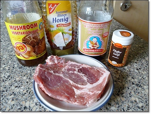 - หมักสันคอหมูกับน้ำผึ้ง ซอสปรุงรส น้ำมันหอยและพริกไทยขาว