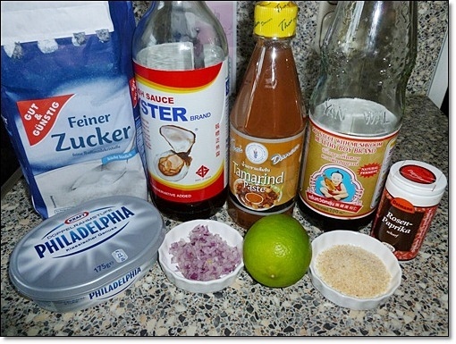 - นำครีมชีสออกมาตั้งที่อุณหภูมิห้องเพื่อให้นุ่มขึ้น ทำน้ำจิ้มแจ่ว โดยผสม