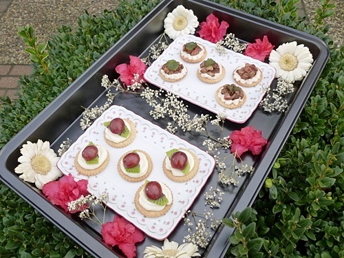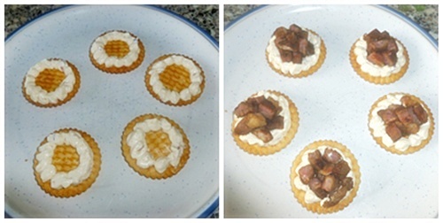 - นำแครกเกอร์ออกมาวางเรียงไว้ บีบครีมชีสแจ่วลงไปให้สวยงาม จากนั้น