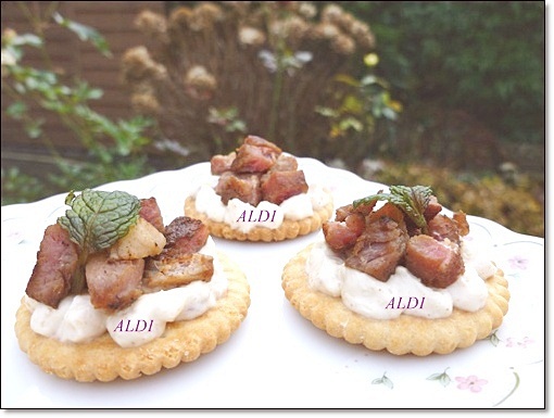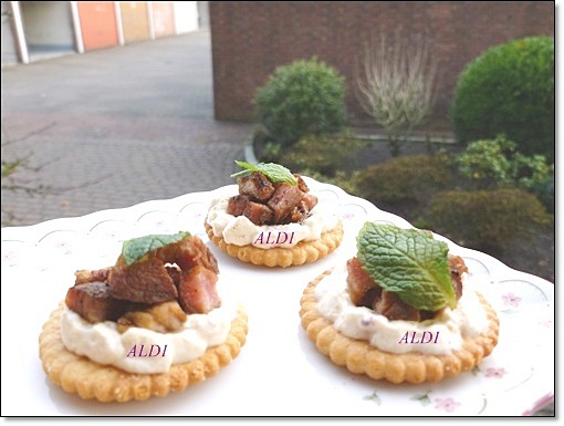 นำคอหมูย่างที่หั่นไว้วางลงไปบนแครกเกอร์ ตกแต่งด้วยใบสะระแหน่