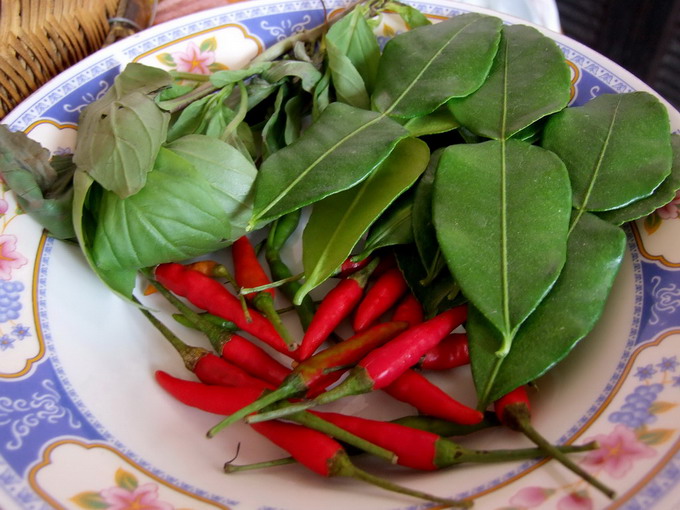 อันดับแรกน่ะค่ะ มีเครื่องที่ใช้ก็ พริกชี้ฟ้า(แต่เราไม่มีค่ะ เลยต้องใช้พรกสดแทน เหอเหอ) ใบโหระพา ใบมะกรูด ค่ะ