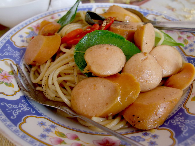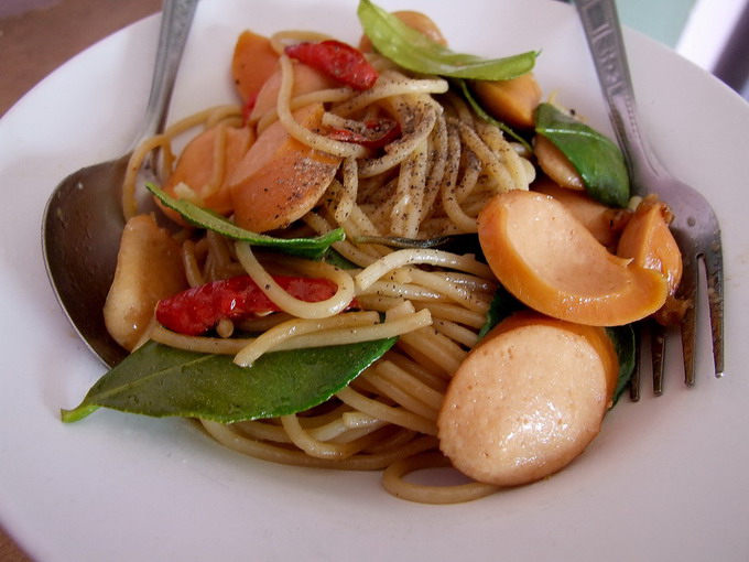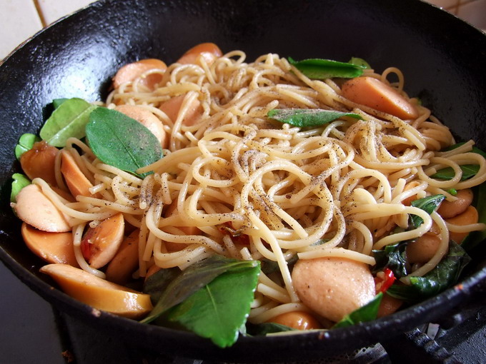 สปาเก็ตตี้ผัดขี้เมาไส้กรอก สูตรเดี้ยน คร่า
