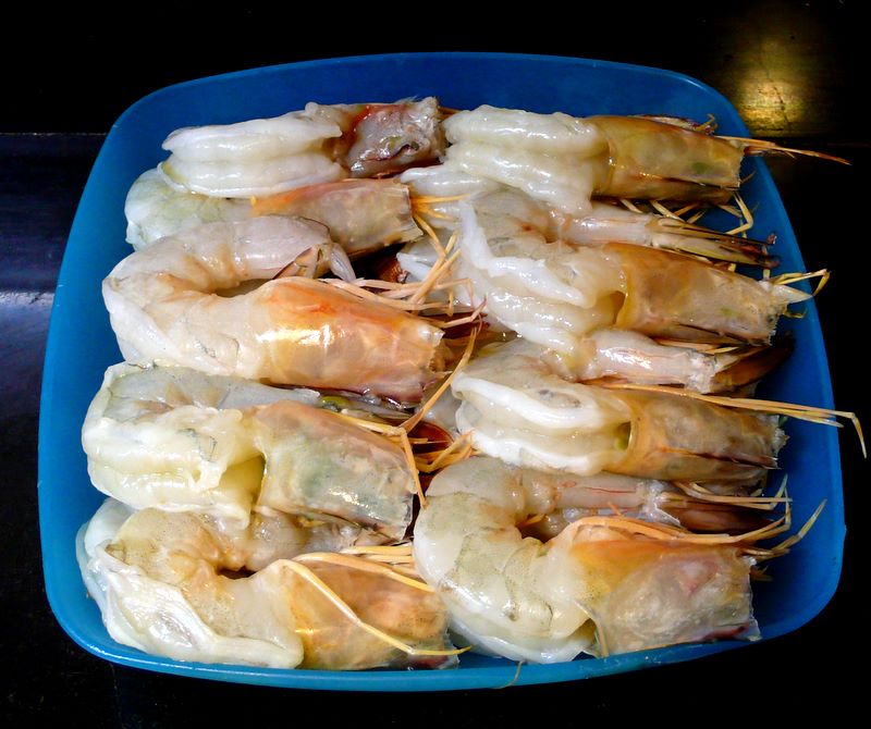 กุ้งนำมาปอกเปลือกผ่าหลังก่อน
