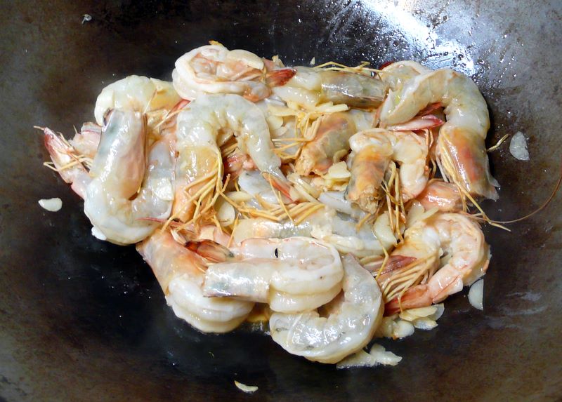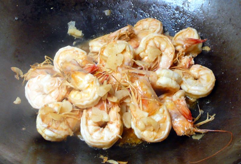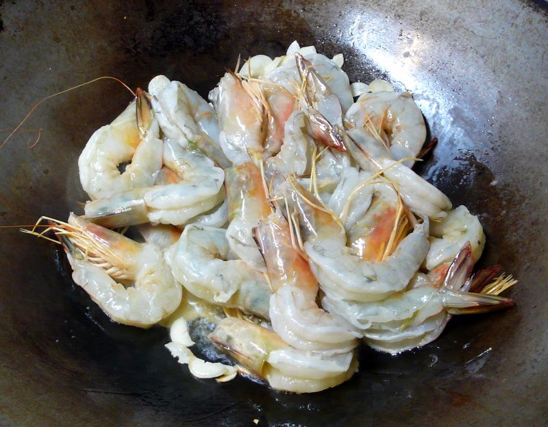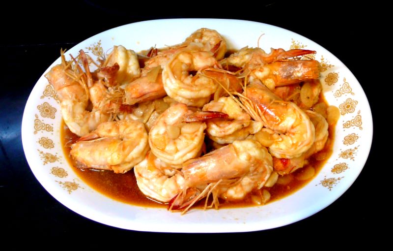 อาหารง่ายๆ ปรุงโดยเน้นรสชาติกุ้งเป็นหลัก เสริมรสกุ้งด้วยกระเทียม ซีอิ้วและเหล้าจีน
