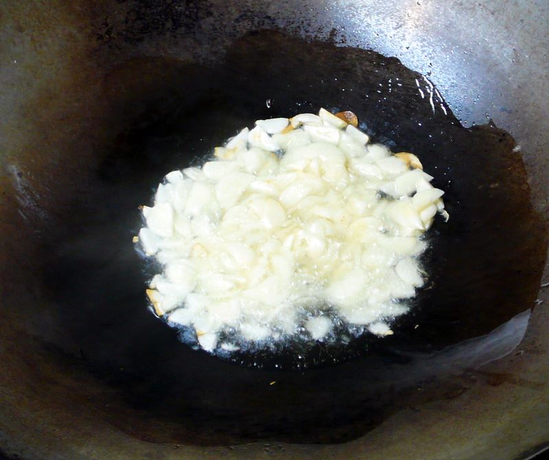 กระเทียมโทน 10 หัว ซอยเป็นชิ้นบางๆ นำไปผัดในน้ำมันก่อนไฟกลาง ผัดให้กระเทียมหอม แต่อย่าให้กระเทียมเปลี่ยนสี