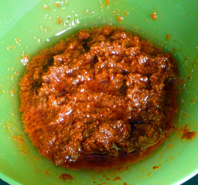 นำพริกแกงผสมน้ำมัน ลงไปหมักให้ทั่ว