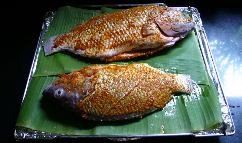 ก่อนหมักปลากับพริกแกง จะบีบมะนาวลงไปคลุกที่ตัวปลาก่อน ใช้มะนาวนิดเดียว เพื่อลดกลิ่นคาวปลาลง แล้วแบ่งพริกแกงผสมน้ำมันไว้ 1/4 ก่อน ไว้ทาที่ตัวปลาเวลาพลิกกลับด้านตอนอบ
