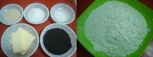 1. เทแป้ง ยีสต์ น้ำตาล เกลือ ลงในอ่างผสม เทน้ำอุ่นลงตรงยีสต์ คนให้ส่วนผสมจับตัวกันเป็นก้อน