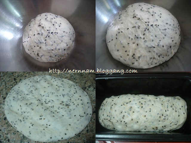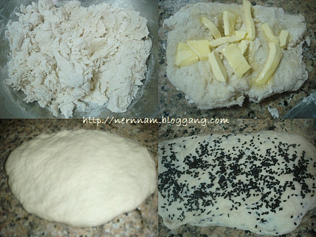 ให้นวดไปสักครู่จนแป้งไม่ติดมือ จากนั้นใส่งาในแป้ง ค่อย ๆ ยืดแป้งออกให้งากระจายทั่วกัน