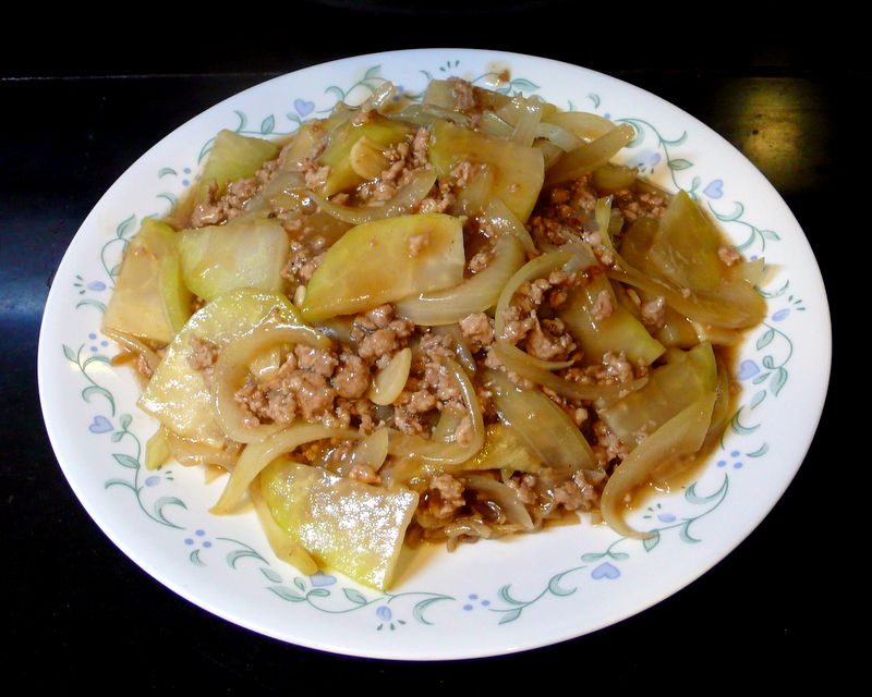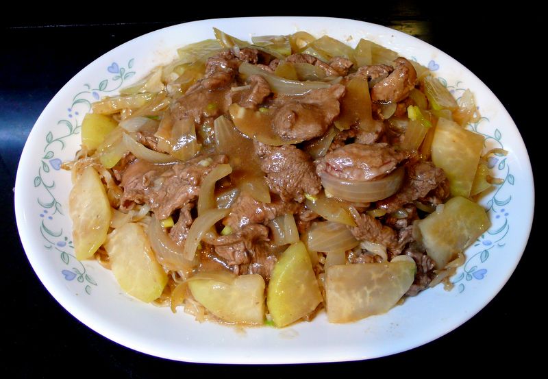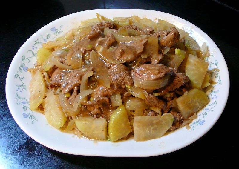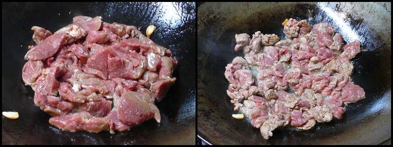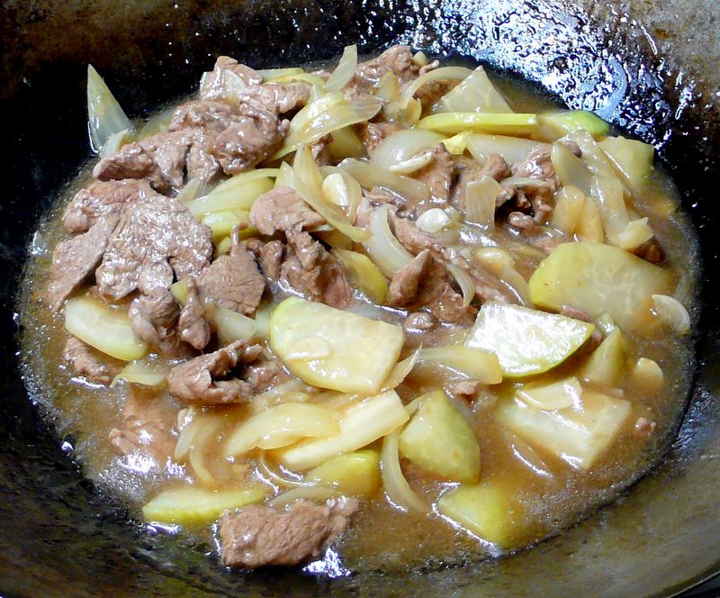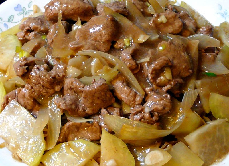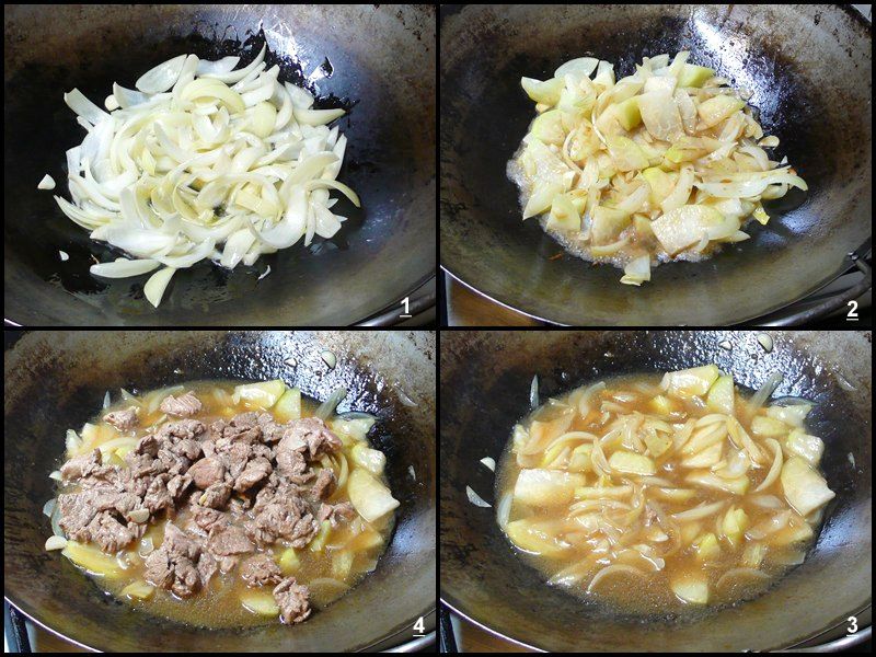 ตักเนื้อใส่จานไว้ก่อน นำหอมใหญ่ลงไปผัด พอหอมสุก ใส่กะหล่ำปมที่หั่นไว้แล้วลงไป ผัดให้สุกเติมน้ำซุปลงไปด้วย เพื่ออบให้กะหล่ำปมนิ่ม ปรุงรสด้วยซีอิ้วขาว เหล้าจีน ซีอิ้วดำนิดหน่อย แล้วเติม แป้งมันฮ่องกงลงไปจนน้ำซอสข้น เติมเนื้อที่ผัดไว้ลงไป