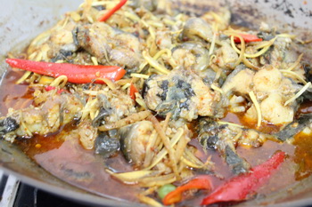 4. ใส่กระชายลงผัด และ พริกแดงหั่นแฉลบ ผัดให้เข้ากัน ปิดไฟ