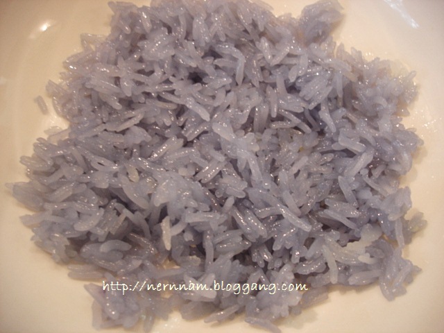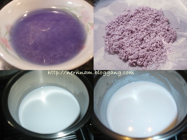 1. แช่ข้าวเหนียวกับน้ำดอกอัญชัญ (หรือสีผสมอาหาร) ให้ข้าวเหนียวเปลี่ยนสี แล้วนำไปนึ่งให้สุก