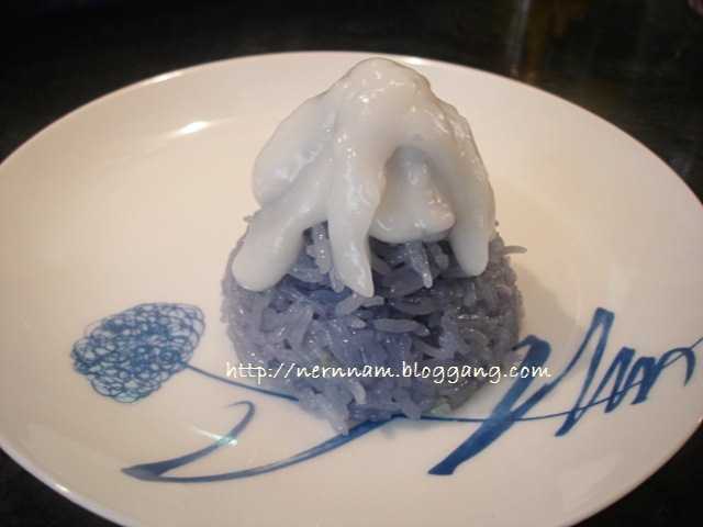 3. หัวกะทิ ใส่เกลือและแป้งข้าวเจ้าเล็กน้อยตั้งไฟให้สุกข้น ราดบนข้าวเหนียวมูน