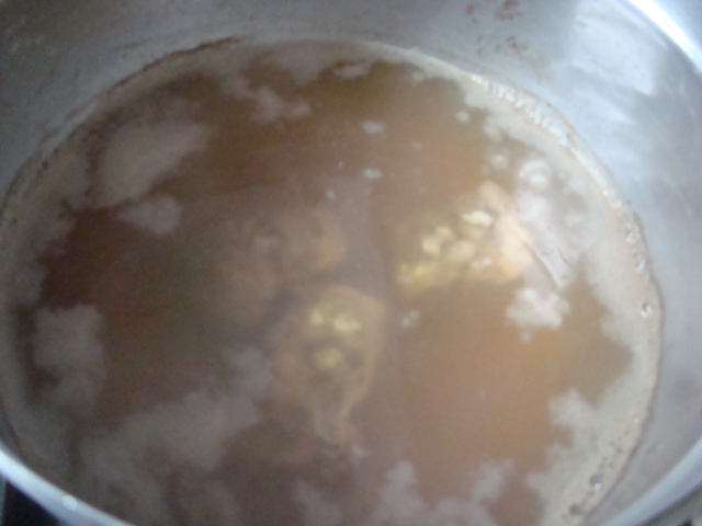 5. น้ำซุปกระดูกหมู ใช้ กระดูกหมู 3-4 ชิ้น + น้ำเปล่า 1 ลิตร + เกลือ ½ ช้อนชา + ซีอิ้วขาว + พริกไทย 1 ช้อนชา + กระเทียม 2-3 กลีบ