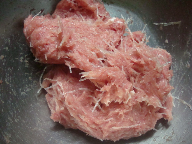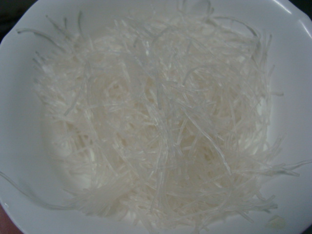 3. วุ้นเส้นแช่น้ำจนเส้นฟองดี เตรียมไว้ (เราใช้ตรามังกร เหนียวนุ่ม ไม่ยุ่ย) หั่นให้สั้นๆ ประมาณ 1 นิ้ว