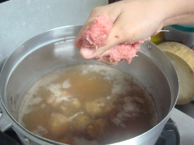 7. พอน้ำซุปได้ที่ ก็จัดการปั้นหมูเป็นก้อนกลมๆ ใส่ลงไปในหม้อ