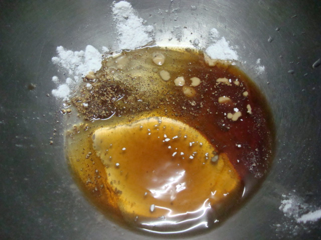 4. เครื่องปรุงรส ซีอิ้วขาว 2 ช้อนโต๊ะ + ซอสหอยนางรม 1 ช้อนโต๊ะ + น้ำตาลทราย 1/2 ช้อนชา + แป้งมัน 1 ช้อนชา