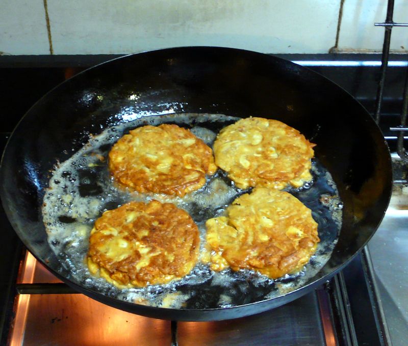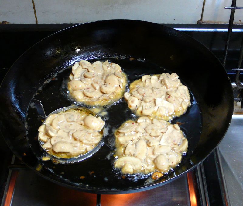 จัดการทอดห่อหมก โดยเอาพิมพ์กลมที่ไว้ใช้ทอดไข่ดาวมาช่วยในการทอดห่อหมก ทำให้ห่อหมกเห็ดแชมปิญองทอดออกมาเป็นแผ่นกลม