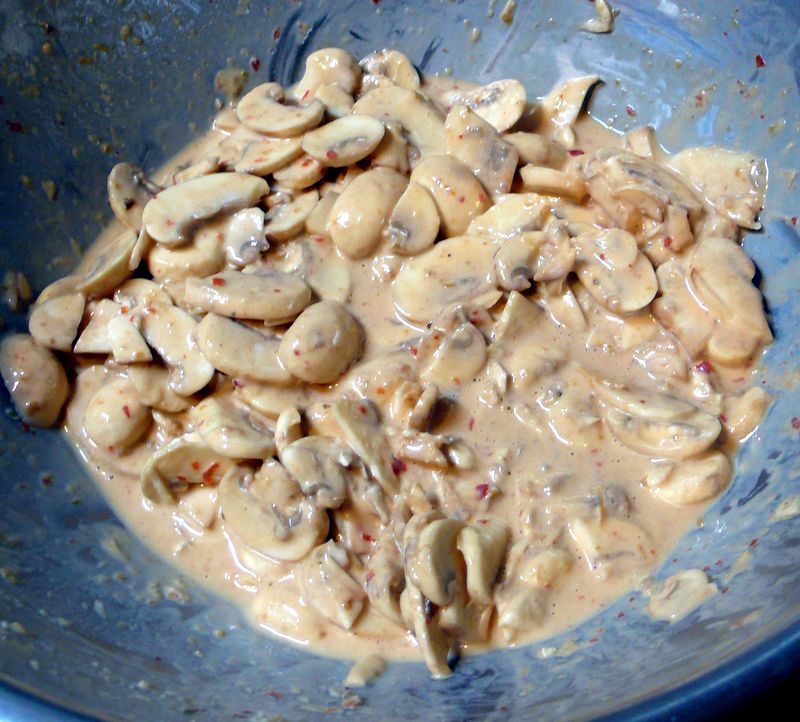 เอาหัวกะทิใส่ไปในเห็ดแชมปิญองที่หั่นไว้ กะให้ท่วมเห็ดพอดี ใส่พริกแกงใต้ พร้อมกับไข่เป็ดลงไป ปรุงรสด้วยน้ำปลา กวนห่อหมกให้เข้ากัน ปรากฏว่าห่อหมกเหลวเกินไป เพราะเห็ดไม่ดูดซับน้ำกะทิเหมือนกับเนื้อปลา เลยต้องใส่แป้งสาลีและแป้งข้าวเจ้าเพิ่มลงไป จนกระทั่งเนื้อห่อหมกเหนียวพอที่จะนำไปทอดได้