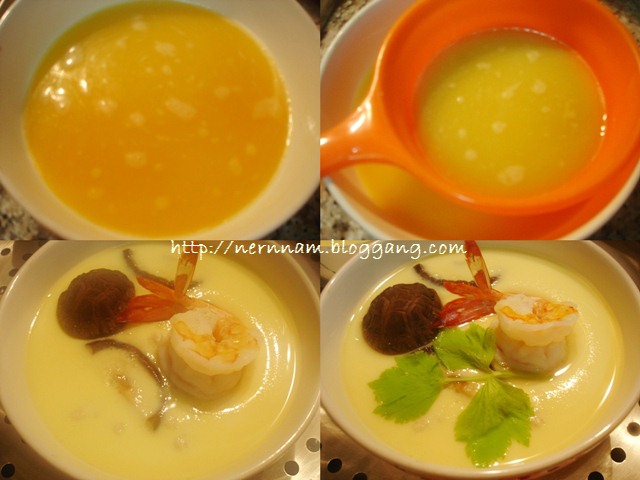 2. ตีไข่ให้เข้ากัน ใส่น้ำซุปตามข้อ 1 และปรุงรสด้วยเกลือ โชยุ มิริน