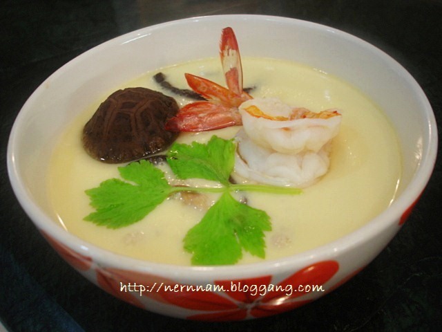 3. นำไข่มากรองเพื่อแยกเศษไข่ขาวออก เอาหมูสับ เห็ดหอม และไข่ใส่ถ้วย นึ่งไฟอ่อน ๆ