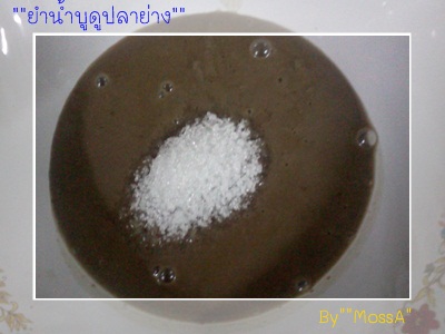 จากนั้นใส่น้ำตาลทรายลงไปค่ะ ต้องใส่ให้มากหน่อยเพื่อตัดรสเค็มจัดของบูดู แต่เราสามารถเจือจางรสเค็มลงได้โดยเติมน้ำต้มสุกลงไปเล็กน้อยค่ะ (ส่วนตัวแล้วไม่ชอบเติมน้ำ เพราะทำให้รสของบูดูไม่เข้มข้น)