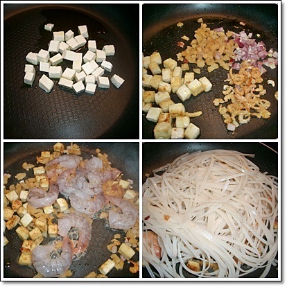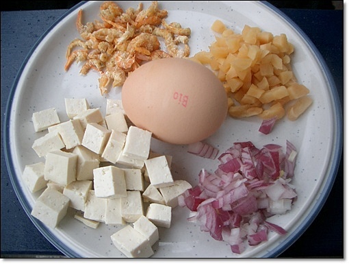 - พอเต้าหู้ใกล้เหลืองใส่หอมแดง หัวไชโป๊ และกุ้งแห้ง ผัดพอสุกหอม