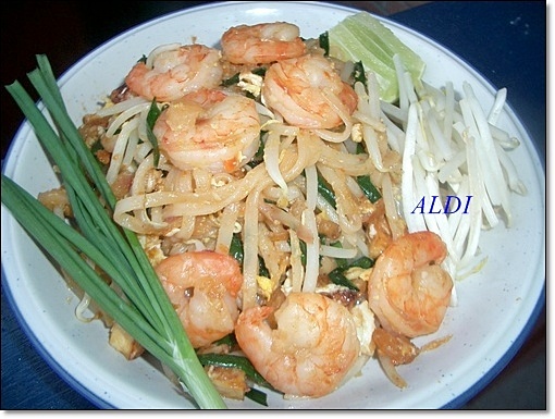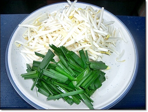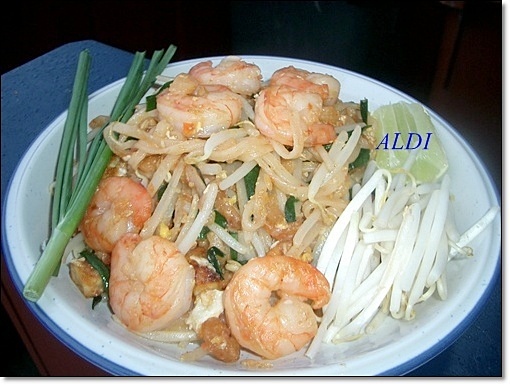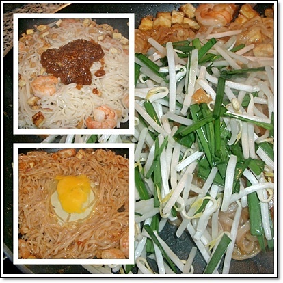 - พอไข่สุกผัดเส้นมาทับ ใส่ถั่วงอกและกุยช่าย ผัดพอเข้ากัน
