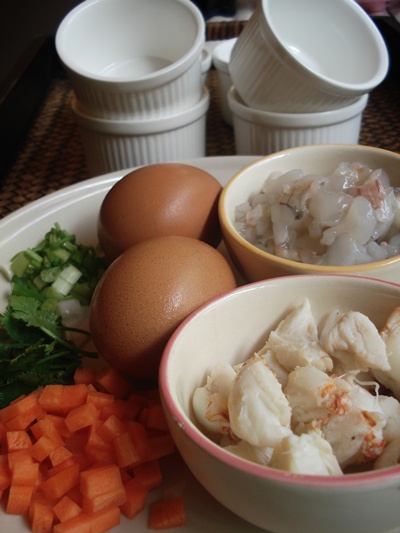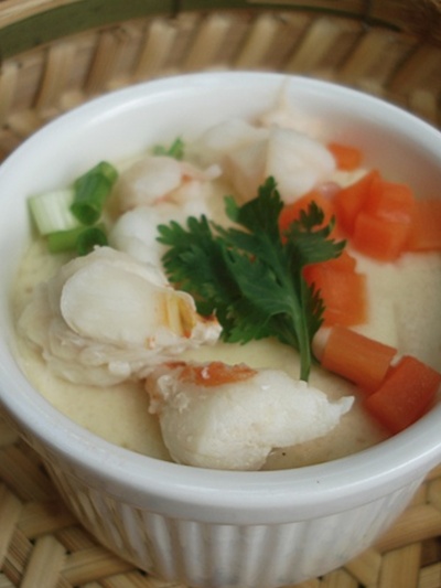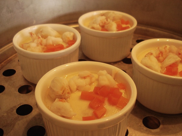 ๒. นำไข่ที่ตีแล้ว นำไปกรองเอาเศษไข่ขาวออก ใส่กุ้งหั่น เนื้อปู เล็กน้อย