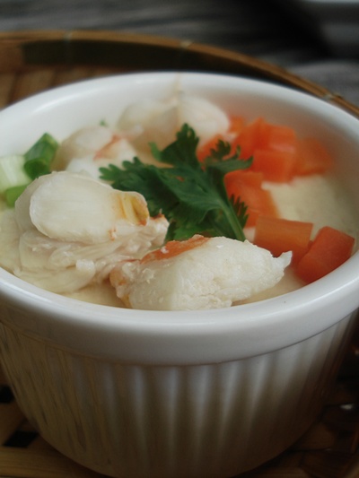 ใส่เนื้อปู ,เนื้อกุ้ง ,แครอทลงไป ปิดฝานึ่งต่อ