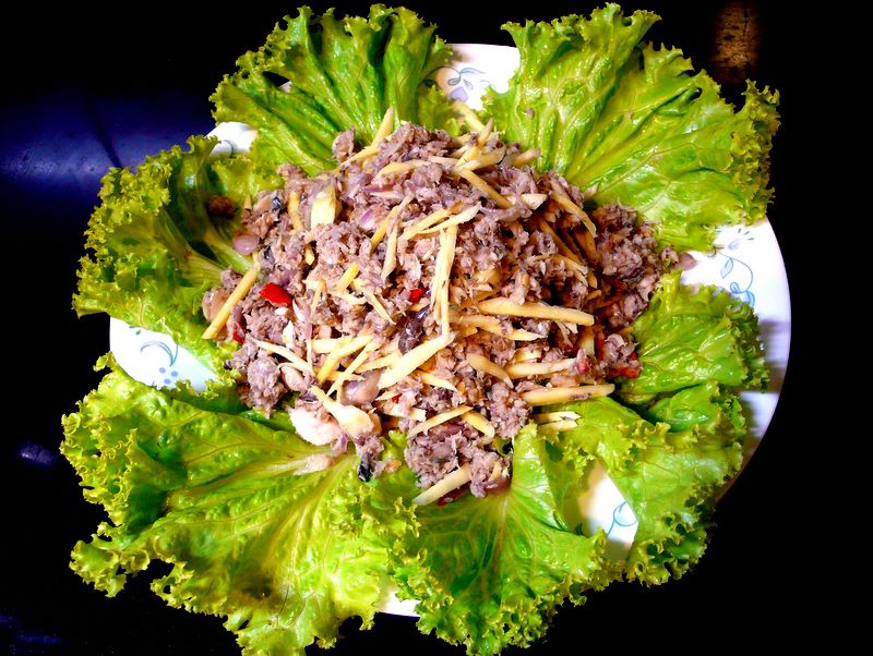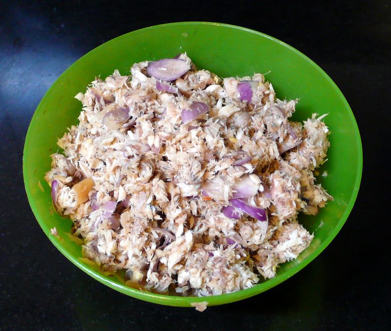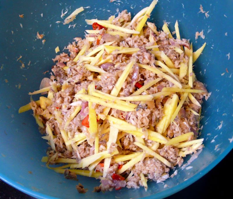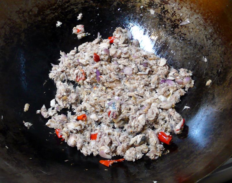 เนื่องจากซื้อปลาทูนึ่งมาจากตลาด ไม่ได้ทำการนึ่งเนื้อปลาทูก่อน เลยต้องนำเนื้อปลาทูที่คลุกเครื่องยำไปผัดให้ร้อนๆ ก่อน เพื่อความปลอดภัย